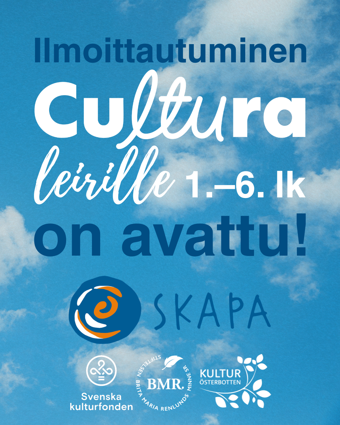 8.–12. kesäkuuta 2026 Cultura ja SKAPA: Viisi kuntaa tasa-arvoisen taideopetuksen puolesta järjestävät innostavan luovan leirin lapsille, jotka käyvät kevätlukukaudella 2026 vuosiluokkia 1–6. Leiri pidetään Närpiön yläasteella, ja se on tarkoitettu lapsille Maalahdesta, Korsnäsistä, Närpiöstä, Kaskisista ja Kristiinankaupungista. Leirin aikana lapset pääsevät viiden päivän aikana tutustumaan viiteen eri taidelajiin: tanssiin, musiikkiin, teatteriin, sanataiteeseen ja kuvataiteeseen.